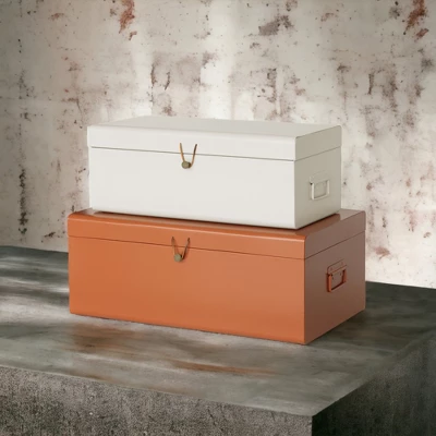 You want to declutter your space, but you want something that’s attractive and doesn’t look like your typical storage unit. You’re in luck. The American Atelier Set of 2 Metal Trunk Chest is a decorative way to declutter your space and perfect for storing a variety of items. Incredibly practical and very stylish, this set will make an elegant addition to any home. Furnished in burnt orange & off white to appeal to everyone’s taste, these vintage-styled trunks will bring a retro look to your interior space. Elegant clasps and handles provide the perfect finishing touches, brightening and enhancing your existing decor. Featuring two spacious sizes for holding various belongings, these trunks are perfect for storing bedding, towels, extra linens, clothes, shoes, toys, magazines, and general accessories. For a creative flair, place a trunk beside your bed and use it as a nightstand or place it alongside your sofa as a unique side table. It’s sure to create visual appeal and interest wherever it’s placed. This set will make a great gift for birthdays, holidays, housewarmings, bridal showers, and those going off to college. A versatile way to declutter and store a huge assortment of items, these different-sized vintage storage trunks are also stackable, allowing you to make the most of your existing space. As such, they’re ideal for apartments, dorm rooms and small bedroom spaces, providing you with sufficient space to organize your belongings in a chic, fashionable way.