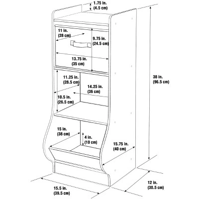 Badger Basket’s Upright Storage Nook is perfect for organizing small spaces. With a small footprint measuring only 12 inches long x 15.25 inches wide, it allows for maximum storage in minimum space. Perfect for storing small toys, books, stuffed animals, and puzzles; the Upright Storage Nook is ideal for kid’s rooms, playrooms, and even family rooms. Have more space? No problem. Line up 2 or 3 Storage Nooks together to create a custom storage solution that is perfect for your family. Includes one removable and reversible storage basket, two shelves, and one angled bin. Solid panel construction ensures that your treasured items stay inside the unit – nothing falls out the back or sides. Smooth surfaces are easy to clean and maintain. Made with laminated wood, melamine finish and metal hardware. Basket made with non-woven fabric and has internal cardboard support panels. Overall dimensions are 15.25 inches wide x 12 inches deep x 38 inches high (15.5 inches wide at the bottom). Shelf areas each: 14.25 inches wide x 11 inches deep x 10.5 inches high. Basket: 13.75 inches wide x 11 inches deep x 9.5 inches high. Bottom bin – interior width and height: 14 inches wide x 11 inches deep (13 inches deep at top of angled ledge) x 11 inches high. Bottom bin opening measures 14 inches wide x 7 inches high. Assembled weight is 25 pounds. All measurements approximate. Wipe clean with a lightly dampened cloth and mild detergent as needed and dry thoroughly. Spot clean the baskets as needed with cold water and mild detergent and allow to air dry (never immerse in water). Adult assembly required. Illustrated assembly instructions included. Non-toxic. Product complies with all currently applicable safety standards and CARB ATCM standards. Product may vary slightly from shown and described. Props/accessories shown are for illustration purposes only and are not included with the product. Actual color/finish may vary slightly from screen display. This item ships in its original carton that may include a product photo.