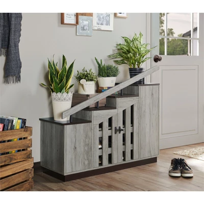 Add this novelty-style, vintage gray oak staircase shoe cabinet to your home and instantly start conversations. The cabinet doors open up to shelves for shoes, while the top is fashioned to resemble a staircase with handrail – all in an oak finish with contrasting accents and details. This piece is crafted for quality of wood and metal.Features : Includes: One (1) Shoe CabinetStyle: NoveltyFinish: Vintage Gray OakMaterials: Particle Board, MDF, SteelCabinet doorsStaircase-style topDecorative protective guard railEasy to follow step by step assembly guide includedSpecifications : Product Dimensions : 45.43″W x 15.59″D x 37.55″HProduct Weight : 33 lbsWeight Capacity : 50 lbsAssembly Required : YesWarranty Description : 90-Day Manufacture Limited Replacement Parts Warranty
