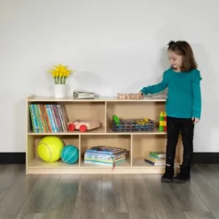 - Stackable toy organizer features angled compartment for attractive, partially-enclosed storage
