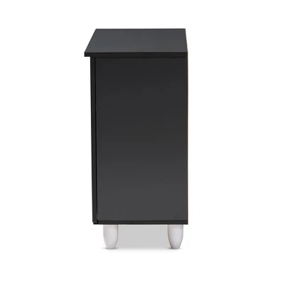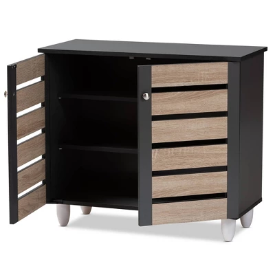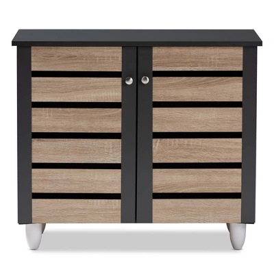 With a compact and elegant design, the Gisela shoe cabinet is perfect for houses with space constraints. Constructed from solid particle board, the Gisela features a two-tone oak and dark gray finish that is easy to coordinate with a wide range of decor styles. Two doors conceal two shelves with storage space for up to nine pairs of shoes. The doors feature open slats to enable air circulation and prevent mold growth on your shoes. White PVC legs provide elevation for easy dusting. The Gisela shoe cabinet is made in Malaysia and requires assembly. Dimensions: 26.3″ High x 30″ Wide x 13.1″ Deep; Upper Shelf: 6.42″ High x 28.03″ Wide x 9.25″ Deep; Middle Shelf: 6.93″ High x 28.03″ Wide x 9.25″ Deep; Lower Shelf: 7.17″ High x 28.03″ Wide x 11.73″ Deep; Legs: 3.74″ High