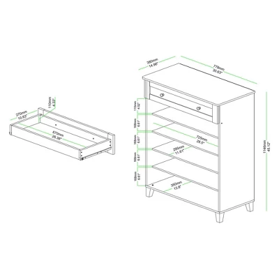 - Overall Dimensions: 45.10″ High x 30.60″ Wide x 15.00″ Deep; Drawer Dimensions: 26.40″ Wide x 10.60″ Deep x 4.30″ High; Larger Shelf Dimensions: 28.00″ Wide x 11.60″ Deep x 6.60″ High; Smaller Shelf Dimensions: 28.50″ Wide x 11.60″ Deep x 4.50″ High; Legs: 3.50″ High;