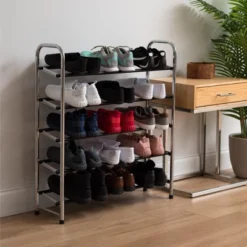 - Five (5) shelves provide space for 15 pairs of shoes, measuring below 13.5″ in depth