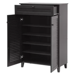 Featuring a classic design and ample storage space, the Glidden shoe cabinet offers a stylish method to keep your entryway organized. Made in Malaysia, this cabinet is constructed from sturdy wood accented with inset paneling. Two doors conceal five shelves with space to store approximately 15 pairs of shoes, depending on size. Requiring assembly, the Glidden features a large drawer for convenient storage of all your outdoor essentials. The doors showcase a recessed grid pattern for added visual texture, making the Glidden shoe cabinet a sleek addition to any space. Overall Dimensions: 45.10″ High x 30.60″ Wide x 15.00″ Deep; Drawer Dimensions: 26.40″ Wide x 10.60″ Deep x 4.30″ High; Larger Shelf Dimensions: 28.00″ Wide x 11.60″ Deep x 6.60″ High; Smaller Shelf Dimensions: 28.50″ Wide x 11.60″ Deep x 4.50″ High; Legs: 3.50″ High;