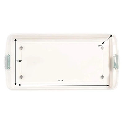 - SPECIFICATIONS: Material: Plastic; Color: Clear Base, Red Lid, Green Latch; Dimensions (L x W x H): 40.00 x 20.00 x 6.12; Weight: 7.25 pounds