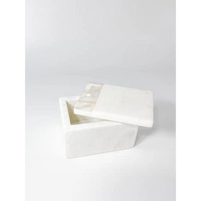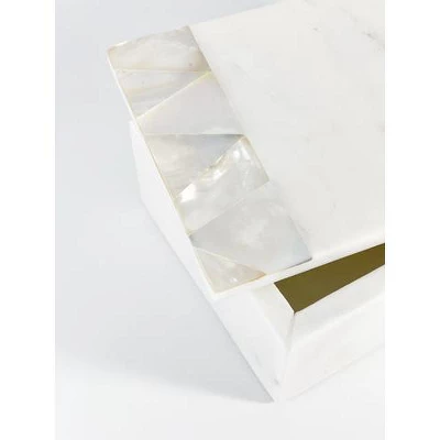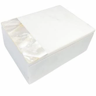 The White Mother of Pearl White Marble Decor Box is accented with Genuine Mother of Pearl with a natural Iridescent Grey color tone with hints of light golden accents. When light hits each piece, the iridescent colors shine bright against the White Marble background creating a luxurious, natural experience. Each piece is hand made; white gift box included.