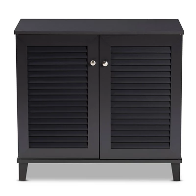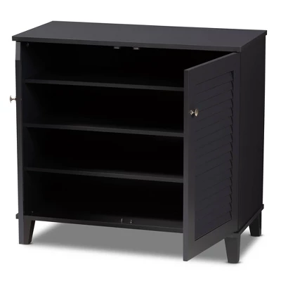 Store your shoes on the sly with the Coolidge shoe cabinet. Two slatted doors, fitted with round knobs, conceal four shelves with storage space for up to 12 pairs of shoes. Tapered legs add refined style and provide elevation to deter dust buildup. Constructed from engineered wood, the Coolidge showcases a sleek dark gray finish that complements any color scheme. The Coolidge shoe cabinet is made in Malaysia and requires assembly. Dimensions: 27.4″ High x 25.6″ Wide x 14.6″ Deep; Shelves: 4.3″ High x 27.6″ Wide x 11.4″ Deep; Legs: 3.5″ High