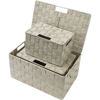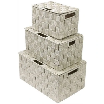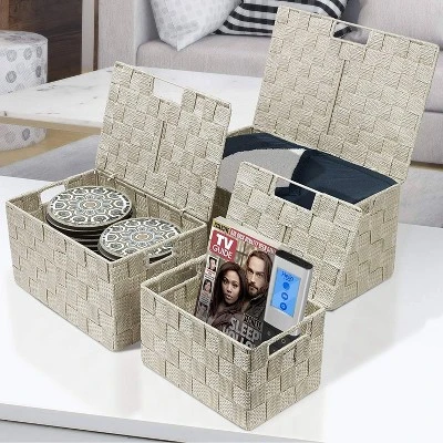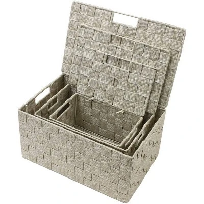 - 3-PIECE WOVEN BASKET BINS WITH LIDS (BEIGE) — Provides attractive, lightweight storage while keeping household items tidy and concealed — Set includes 3 stackable utility baskets of various sizes